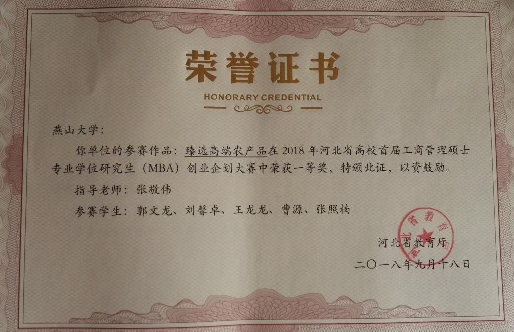 2018年10月14日下午,由天津市教育委员会、北京市教育委员会、河北省教育厅联合主办的首届京津冀MBA专业学位研究生尖峰时刻创业企划大赛圆满闭幕。我校2017级MBA学员郭文龙、刘馨卓、王龙龙、曹源、张照楠等5人的参赛作品《臻选高端农产品》荣获大赛二等奖,我校张敬伟教授荣获最佳指导教师,乌鸦传媒荣获最佳组织奖。