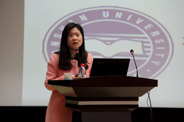 第三位做报告的是我校环境与化学工程学院博士生导师杨靓月教授,她做了题为《合成创造美丽世界》的报告。杨教授结合自己的研究,分享了在天然产物全合成、有机合成方法学、药物化学及有机功能材料的合成及研究方面的科研探索过程及研究成果。她深入浅出地介绍了相关概念及科普知识,还结合自己的科研经历,勉励研究生勇于提出问题,善于观察、实验,不惧失败,不断前行。